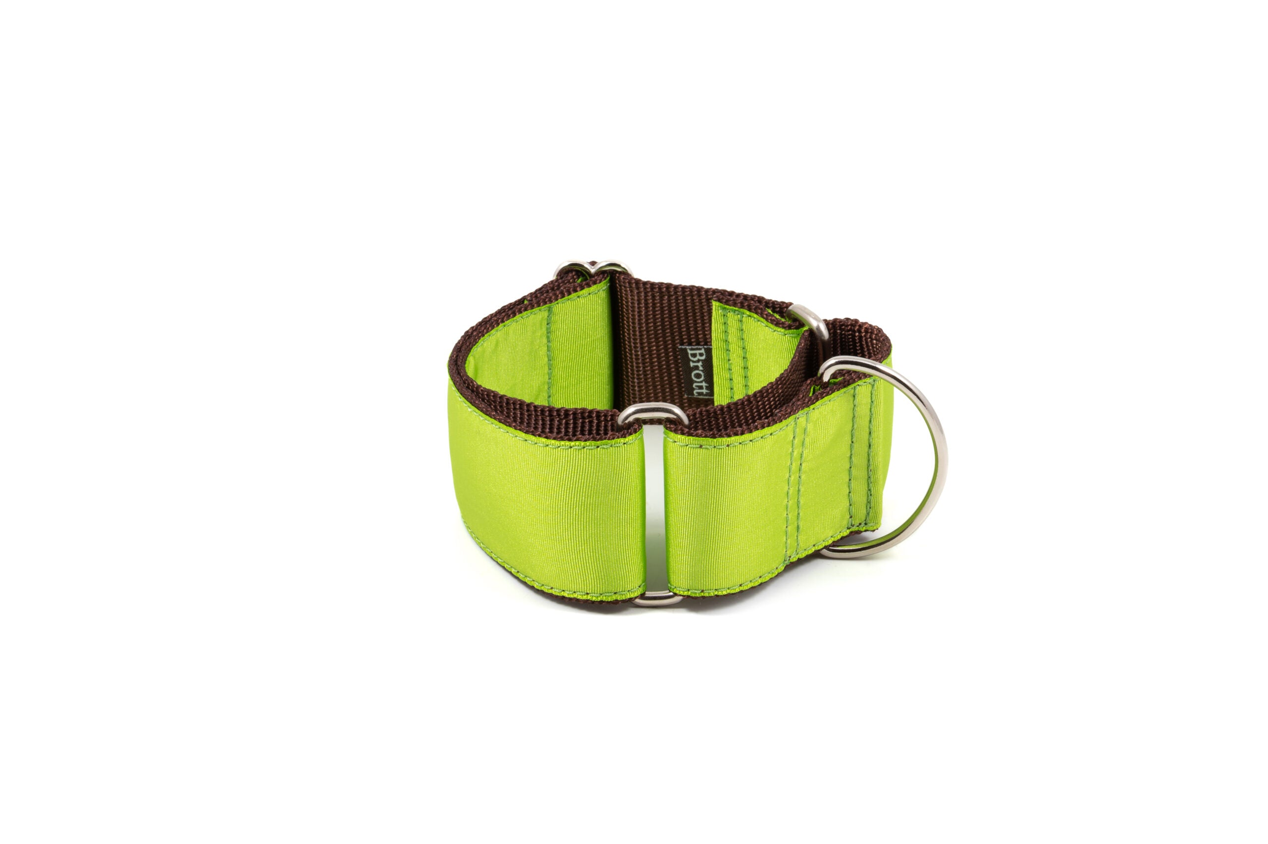 Zgarda este realizată manual dintr-o bandă de nailon maro, rezistentă și plăcută la atingere. Deasupra este aplicată o panglică satinată colorată, cu broderie în ton. Catarama Brott este din aluminiu de calitate superioară, lustruită și prevăzută cu sistem de siguranță. Eticheta Brott este confecționată dintr-un aliaj metalic cu strat fără nichel.